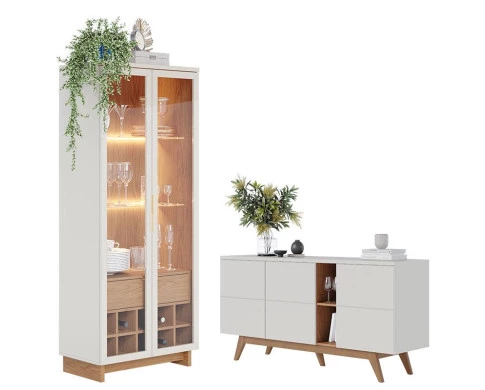 Apresentamos este conjunto de Cristaleira Guanabara e Aparador Buffet Noronha, fabricados pela Colibri. A cristaleira possui uma gaveta espaçosa com corrediças telescópicas que trazem mais suavidade ao abrir e fechar. Seu destaque fica nas portas em vidro com moldura estilo retrô, e com puxadores metálicos dourados permitindo que todo conteúdo interno fique à vista, duas prateleiras em vidro equipadas por fita led dando aquele toque sofisticado para seu ambiente e uma adega com capacidade de acomodar até dez garrafas. O aparador possui três portas com detalhes chanfrados, duas prateleiras internas com amplo espaço para organizar seus utensílios domésticos, dois nichos para exibir seus objetos e seu tampo possibilita acomodar seus itens decorativos e também servir jantares em seu lar. Fabricados com materiais de alta qualidade que garante resistência e durabilidade aos produtos. Confira mais detalhes e aproveite!