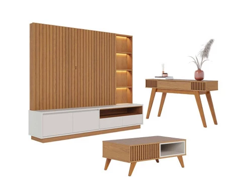 Apresentamos este conjunto de Home Theater Cancún com Mesa de Centro Jeri e Aparador Riviera, fabricados pela Colibri. O home possui cinco nichos decorativos com LED, duas gavetas e dois gavetões com corrediças telescópicas, dando mais suavidade ao abrir e fechar. A mesa possui detalhe ripado artesanal, nichos interno em dois lados de forma espelhada e pés em madeira maciça. O aparador possui 01 gaveta central com corrediças telescópicas, puxador metálico dourado fosco, ripado artesanal nas laterais, peças traseiras com acabamento possibilitando a utilização do móvel para divisão de ambientes e pés em madeira maciça Una praticidade, funcionalidade e estilo para seu ambiente! Garanta já o seu!