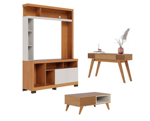 Estante Home Theater Elba com Mesa de Centro Jeri Freijó Off White Matte e Aparador Riviera Freijó – Colibri
