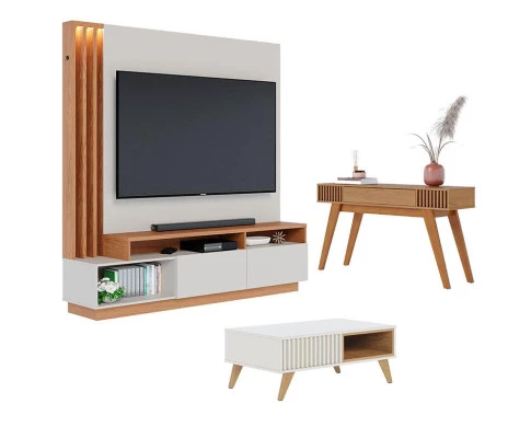 Estante Home Theater Humaitá com Mesa de Centro Jeri Off White Matte Freijó e Aparador Riviera Freijó – Colibri