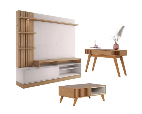 Estante Home Theater Maceió com Mesa de Centro Jeri Freijó Off White e Aparador Riviera Freijó – Colibri
