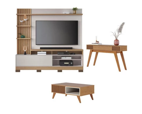 Estante Home Theater Maceió Com Pés com Mesa de Centro Jeri Freijó Off White e Aparador Riviera Freijó – Colibri