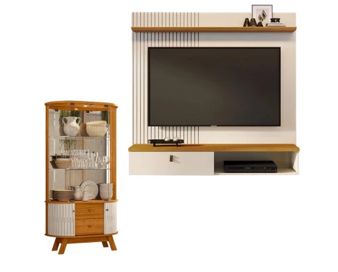 Estante Home Theater Suspenso Íris com Cristaleira Moss Cinamomo Off White – Madetec