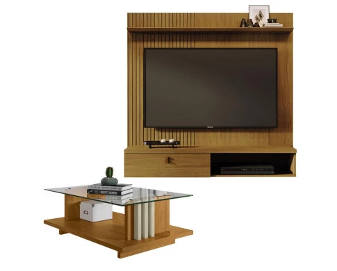 Estante Home Theater Suspenso Íris Cumaru com Mesa de Centro Frizz Cumaru Opala - Madetec