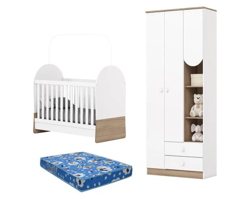Guarda Roupa 3 Portas e Berço Mini Cama Magia Branco Jequitibá HP com Colchão 130x60 Tend Tudo Móveis - Henn