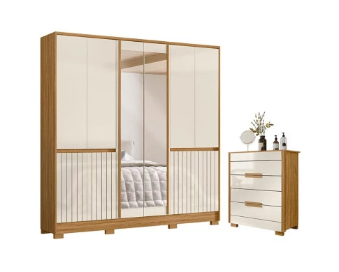 Começou a montar seu quarto? Então apresentamos para você este belo conjunto composto pelo guarda roupa da linha Alasca e a cômoda da linha Dhara. O guarda roupa conta com dez portas, sendo as duas centrais com espelho. As quatro portas inferiores com detalhes frisados em MDF agregam um charme. Com suas quatro gavetas internas, ganha, mas espaço para acomodar suas roupas. Completando o conjunto, assim como o guarda roupa, a cômoda conta com quatro gavetas equipadas com corrediças telescópicas, puxadores em MDF e pés em PVC, oferecendo mais estabilidade e durabilidade. Fabricados pela Moval, são desenvolvidos em MDP, sendo perfeito para quem busca funcionalidade, beleza e qualidade em cada detalhe. Aproveite e garanta já o seu!