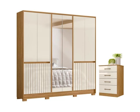 Começou a montar seu quarto? Então apresentamos para você este belo conjunto composto pelo guarda roupa da linha Alasca e a cômoda da linha MS913. O guarda roupa conta com dez portas, sendo as duas centrais com espelho. Os puxadores em MDF garantem mais sofisticação, enquanto as quatro portas inferiores com detalhes frisados em MDF agregam um charme. Com suas quatro gavetas internas são equipadas com corrediças telescópicas, além dos pés em PVC. Completando o conjunto, a cômoda possui quatro gavetas com corrediças metálicas, sendo a última gaveta maior, ideal para acomodar itens maiores. Os puxadores em acabamento bronze traz elegância. Fabricados pela Moval, são desenvolvidos em MDP, sendo perfeito para quem busca organização, durabilidade e um visual moderno. Aproveite e garanta já o seu!
