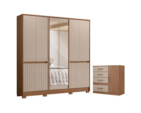 Está procurando móveis para seu quarto? Apresentamos para você este belo conjunto composto pelo guarda roupa da linha Alasca e a cômoda da linha Vênus. O guarda roupa possui dez portas, sendo as duas centrais com espelho. Internamente, oferece quatro gavetas com corrediças telescópicas, ideal para acomodar suas roupas com mais praticidade. Sustentado por pés em PVC, garante mais estabilidade e facilita na hora da limpeza. Complementando o conjunto, a cômoda é composta por quatro gavetas com corrediças metálicas e uma porta. Assim como o guarda roupa, possui detalhe frisado e puxadores em MDF. Fabricados pela Moval, são desenvolvidos em 100% MDP, perfeito para quem busca estilo, organização e praticidade para compor o quarto. Aproveite e garanta já o seu!