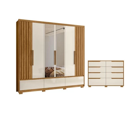 Está montando seu quarto? Apresentamos para você este belo conjunto composto pelo guarda roupa da linha Amazonas e a cômoda da linha Georgia. O guarda roupa conta com seis portas, sendo as duas centrais com espelho e as laterais com detalhes ripados em MDF Os puxadores em MDF complementam o estilo, enquanto suas cinco gavetas, sendo duas internas são perfeitas para uma melhor organização. Já a cômoda com oito gavetas garante um espaço extra para acomodar suas roupas. Os puxadores usinados dão um acabamento refinado. Tanto o guarda roupa, quanto a cômoda são equipados com corrediças telescópicas e pés em PVC assegurando boa durabilidade e fácil manutenção. Fabricados pela Moval, são desenvolvidos em MDP, unindo qualidade, design moderno e um ótimo custo benefício para deixar o quarto do casal mais aconchegante, aproveitem!