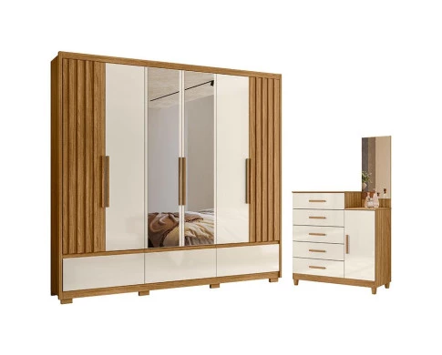Começou a procurar móveis para seu quarto? Apresentamos para você este belo conjunto composto pelo guarda roupa da linha Amazonas e a cômoda da linha Lisboa. O guarda roupa conta com seis portas, sendo as duas centrais com espelho e as duas laterais com detalhes ripados em MDF. Com cinco gavetas, duas sendo internas e equipadas com corrediças telescópicas. Já a cômoda oferece uma porta e cinco gavetas equipadas com corrediças metálicas, oferecendo espaço extra para acomodar suas roupas e calçados. O painel com espelho traz mais praticidade no seu dia a dia. Tanto o guarda roupa, quanto a cômoda possuem puxadores em MDF e pés em PVC, facilitando na limpeza e entregando mais durabilidade. Fabricados pela Moval, são desenvolvidos em MDP. Com esse conjunto, o quarto do casal ganha mais sofisticação, praticidade e organização, aproveitem!