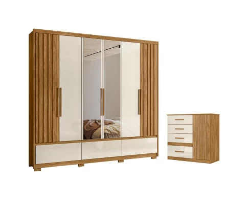 Está procurando móveis para seu quarto? Apresentamos para você este belo conjunto composto pelo guarda roupa da linha Amazonas e a cômoda da linha Vênus. O guarda roupa conta com seis portas, sendo as duas centrais com espelho e as laterais com detalhes ripados em MDF, enquanto as cinco gavetas equipadas com corrediças telescópicas, sendo duas delas interna. Os pés em PVC proporcionam mais estabilidade e facilita na hora da limpeza. Complementando o conjunto, a cômoda conta com uma porta com detalhes frisados e quatro gavetas com corrediças metálicas, oferecendo um espaço extra para acomodar suas roupas e calçados. Tanto o guarda roupa quanto a cômoda, possuem puxadores em MDF, garantindo uma harmonia. Fabricados pela Moval, são desenvolvidos em MDP, sendo a escolha perfeita para quem busca qualidade, beleza e versatilidade para o quarto do casal, aproveitem!