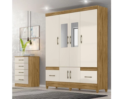 Guarda Roupa Casal Ambiente MS912 com espelho e Cômoda MS913 Freijó Off White – Moval