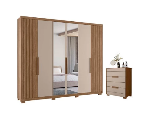 Começou a montar seu quarto? Então apresentamos para você este belo conjunto composto pelo guarda roupa da linha Araguaia e a cômoda da linha Dhara. O guarda roupa conta com seis portas, sendo duas com detalhes ripados em MDF. O destaque fica por conta das três opções na hora de montagem das portas, permitindo a personalização de acordo com seu gosto. Internamente possui quatro gavetas. Complementando o conjunto, a cômoda conta com quatro gavetas, ganhando um espaço extra. Tanto o guarda roupa, quanto a cômoda possuem puxadores em MDF, corrediças metálicas e pés em PVC dando mais resistência e estabilidade. Fabricados pela Moval, são desenvolvidos em MDP, sendo a escolha perfeita para quem busca otimizar o quarto com beleza e praticidade, aproveitem!