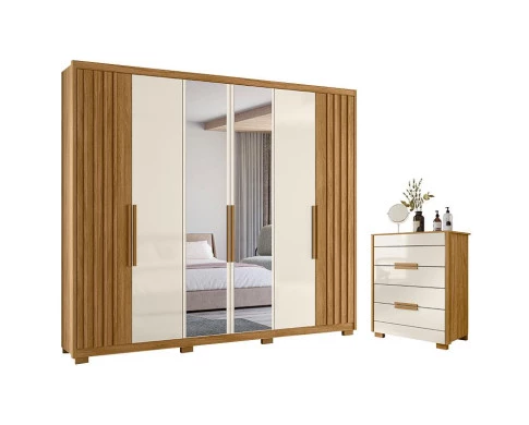 Começou a montar seu quarto? Então apresentamos para você este belo conjunto composto pelo guarda roupa da linha Araguaia e a cômoda da linha Dhara. O guarda roupa conta com seis portas, sendo duas com detalhes ripados em MDF. O destaque fica por conta das três opções na hora de montagem das portas, permitindo a personalização de acordo com seu gosto. Internamente possui quatro gavetas. Complementando o conjunto, a cômoda conta com quatro gavetas, ganhando um espaço extra. Tanto o guarda roupa, quanto a cômoda possuem puxadores em MDF, corrediças metálicas e pés em PVC dando mais resistência e estabilidade. Fabricados pela Moval, são desenvolvidos em MDP, sendo a escolha perfeita para quem busca otimizar o quarto com beleza e praticidade, aproveitem!