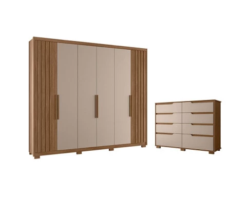 Começou a montar seu quarto? Então apresentamos para você este belo guarda roupa da linha Araguaia e a cômoda da linha Georgia. Com seis portas, sendo duas com detalhes ripados em MDF, dando um toque refinado. Oferecendo três opções na hora da montagem das portas, se adaptando ao estilo e ao seu gosto. Os puxadores em MDF complementa o visual. Internamente, conta com quatro gavetas. Completando o conjunto, a cômoda possui oito gavetas com puxadores usinados. Tanto o guarda roupa quanto a cômoda, contam com corrediças telescópicas e pés em PVC, oferecendo mais estabilidade e durabilidade. Fabricados pela Moval, são desenvolvidos em MDP. Ideal para quem procura praticidade, design moderno, qualidade e organização para o quarto do casal, aproveitem!