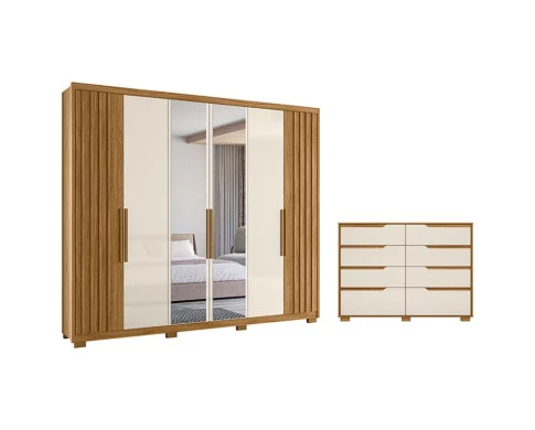 Começou a montar seu quarto? Então apresentamos para você este belo guarda roupa da linha Araguaia e a cômoda da linha Georgia. Com seis portas, sendo duas com detalhes ripados em MDF, dando um toque refinado. Oferecendo três opções na hora da montagem das portas, se adaptando ao estilo e ao seu gosto. Os puxadores em MDF complementa o visual. Internamente, conta com quatro gavetas. Completando o conjunto, a cômoda possui oito gavetas com puxadores usinados. Tanto o guarda roupa quanto a cômoda, contam com corrediças telescópicas e pés em PVC, oferecendo mais estabilidade e durabilidade. Fabricados pela Moval, são desenvolvidos em MDP. Ideal para quem procura praticidade, design moderno, qualidade e organização para o quarto do casal, aproveitem!