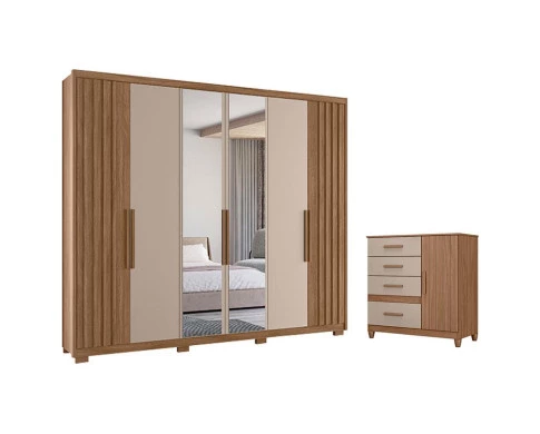 Começou a procurar móveis para seu quarto? Então apresentamos para você este belo conjunto composto pelo guarda roupa da linha Araguaia e a cômoda da linha Vênus. O guarda roupa se destaca por suas seis portas, sendo duas com detalhes ripados em MDF. Com três opções na hora da montagem das portas, se adapta de acordo com o seu gosto. Internamente, conta com quatro gavetas com corrediças telescópicas. Combinando com o guarda roupa, a cômoda possui uma porta com detalhes frisados e quatro gavetas com corrediças metálicas. Assim como o guarda roupa, a cômoda conta com puxadores em MDF e pés em PVC entregando mais estabilidade e durabilidade. Fabricado pela Moval, são desenvolvidos em MDP. Sendo perfeito para quem busca qualidade, beleza e organização, aproveitem!
