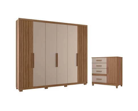Começou a procurar móveis para seu quarto? Então apresentamos para você este belo conjunto composto pelo guarda roupa da linha Araguaia e a cômoda da linha Vênus. O guarda roupa se destaca por suas seis portas, sendo duas com detalhes ripados em MDF. Com três opções na hora da montagem das portas, se adapta de acordo com o seu gosto. Internamente, conta com quatro gavetas com corrediças telescópicas. Combinando com o guarda roupa, a cômoda possui uma porta com detalhes frisados e quatro gavetas com corrediças metálicas. Assim como o guarda roupa, a cômoda conta com puxadores em MDF e pés em PVC entregando mais estabilidade e durabilidade. Fabricado pela Moval, são desenvolvidos em MDP. Sendo perfeito para quem busca qualidade, beleza e organização, aproveitem!