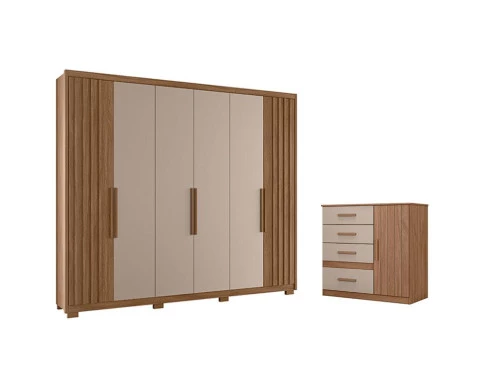 Começou a procurar móveis para seu quarto? Então apresentamos para você este belo conjunto composto pelo guarda roupa da linha Araguaia e a cômoda da linha Vênus. O guarda roupa se destaca por suas seis portas, sendo duas com detalhes ripados em MDF. Com três opções na hora da montagem das portas, se adapta de acordo com o seu gosto. Internamente, conta com quatro gavetas com corrediças telescópicas e pés em PVC proporcionando mais estabilidade e durabilidade. Combinando com o guarda roupa, a cômoda possui uma porta com detalhes frisados e quatro gavetas com corrediças metálicas. Assim como o guarda roupa, a cômoda conta com puxadores em MDF entregando um design moderno. Fabricado pela Moval, são desenvolvidos em MDP. Sendo perfeito para quem busca qualidade, beleza e organização, aproveitem!