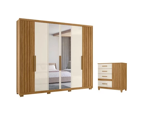 Começou a procurar móveis para seu quarto? Então apresentamos para você este belo conjunto composto pelo guarda roupa da linha Araguaia e a cômoda da linha Vênus. O guarda roupa se destaca por suas seis portas, sendo duas com detalhes ripados em MDF. Com três opções na hora da montagem das portas, se adapta de acordo com o seu gosto. Internamente, conta com quatro gavetas com corrediças telescópicas. Combinando com o guarda roupa, a cômoda possui uma porta com detalhes frisados e quatro gavetas com corrediças metálicas. Assim como o guarda roupa, a cômoda conta com puxadores em MDF e pés em PVC entregando mais estabilidade e durabilidade. Fabricado pela Moval, são desenvolvidos em MDP. Sendo perfeito para quem busca qualidade, beleza e organização, aproveitem!