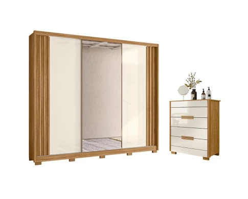 Está montando seu quarto? Apresentamos para você este belo guarda roupa da linha Arizona e a cômoda da linha Dhara. O guarda roupa conta com três portas deslizantes, sendo a porta central com espelho. Os puxadores ripados em MDF dão um toque de sofisticação. Internamente, possui seis gavetas espaçosas. Complementando o conjunto, a cômoda conta com quatro gavetas, ideais para acomodar suas roupas. Tanto o guarda roupa quanto a cômoda, é equipado com corrediças telescópicas e pés em PVC facilitando a limpeza e garantindo mais durabilidade. Fabricados pela Moval, são desenvolvidos em MDP, unindo design moderno, qualidade e praticidade para compor seu quarto com mais estilo, aproveitem!