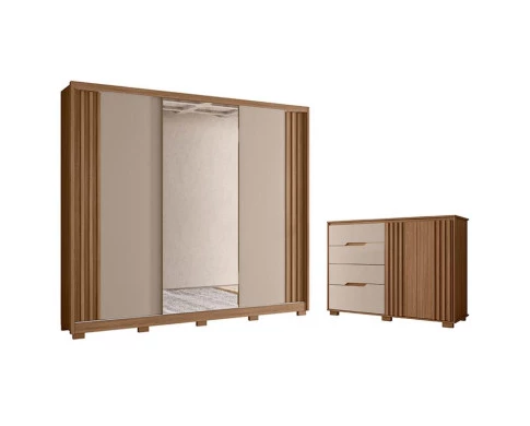 Está montado seu quarto? Apresentamos para você este belo conjunto composto pelo guarda roupa da linha Arizona e a cômoda da linha Texas. O guarda roupa conta com três portas deslizantes, sendo a porta central com espelho. Os puxadores ripados em MDF dão um toque sofisticado, enquanto as seis gavetas internas garantem mais organização. Complementando o conjunto, a cômoda oferece duas portas com detalhes ripados e quatro gavetas, assim como o guarda roupa, são equipadas com corrediças telescópicas e pés em PVC oferecendo mais resistência e durabilidade. Fabricados pela Moval, são desenvolvido em MDP de qualidade, sendo a escolha perfeita para quem deseja complementar o quarto com praticidade, design moderna e organização, aproveitem!
