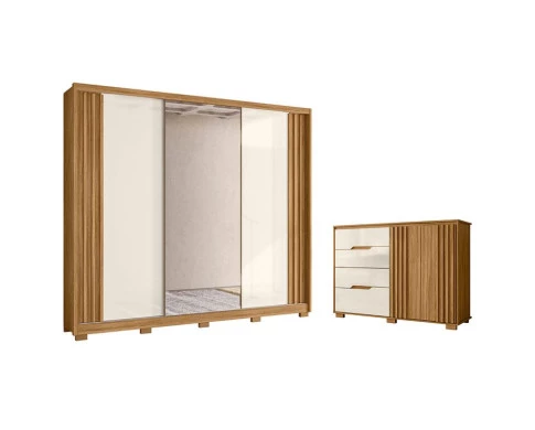 Está montado seu quarto? Apresentamos para você este belo conjunto composto pelo guarda roupa da linha Arizona e a cômoda da linha Texas. O guarda roupa conta com três portas deslizantes, sendo a porta central com espelho. Os puxadores ripados em MDF dão um toque sofisticado, enquanto as seis gavetas internas garantem mais organização. Complementando o conjunto, a cômoda oferece duas portas com detalhes ripados e quatro gavetas, assim como o guarda roupa, são equipadas com corrediças telescópicas e pés em PVC oferecendo mais resistência e durabilidade. Fabricados pela Moval, são desenvolvido em MDP de qualidade, sendo a escolha perfeita para quem deseja complementar o quarto com praticidade, design moderna e organização, aproveitem!