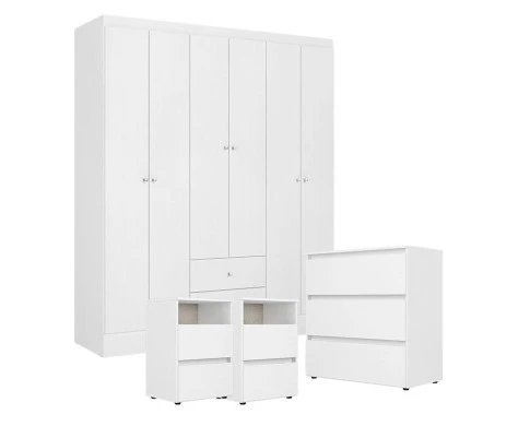 Conjunto completo para transformar seu quarto! O Guarda-Roupa Astro oferece ótimo espaço interno com 6 portas e organização prática para roupas e acessórios. Acompanha a Cômoda Condessa e duas Mesas de Cabeceira da mesma linha, garantindo um visual harmonioso e funcional. Estrutura resistente em MDP e acabamento branco que combina com qualquer decoração.
