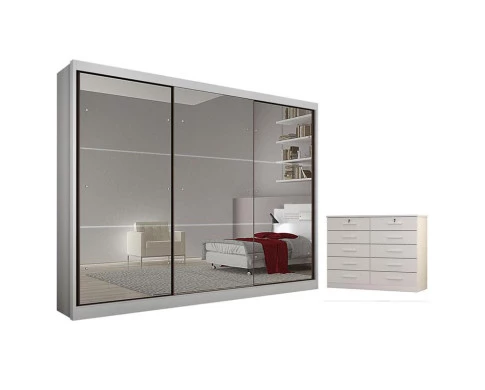 Esta precisando de guarda roupa e cômoda para seu quarto? Nós temos o conjunto ideal para você! Guarda-roupa Atlanta e Gaveteiro da linha Milão, fabricados com materiais de altíssima pela Novo Horizonte. Com um design moderno e funcional o guarda roupa possui várias repartições, gavetas, prateleiras amplo espaço interno garantindo para que suas roupas e acessórios fiquem organizados. O gaveteiro possui 10 gavetas oferecendo espaço extra para guardar os itens de sua preferência. Confira as características e garanta já!