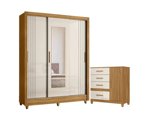 Guarda Roupa Casal Bolívia e Cômoda Vênus com Pés Freijó Off White – Moval