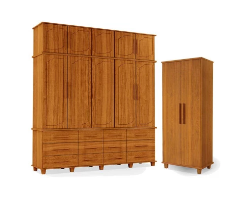 Apresentamos o Guarda Roupa Casal e Armário Multiuso Berlim fabricados pela Luapa Móveis, perfeitos para quem precisa de amplo espaço de armazenamento e organização, oferecendo praticidade e elegância. O Guarda Roupa possui 10 portas, 12 gavetas com corrediças telescópicas, cabideiro em alumínio, prateleiras internas bem distribuídas, maleiro adicional na parte superior para guardar itens maiores, como malas, edredons e roupas de cama, maximizando o aproveitamento do espaço mantendo seu quarto sempre arrumado e pés em madeira. O Armario Multiuso é um móvel ideal para deixar o seu ambiente sempre lindo e organizado, com um grande espaço interno para armazenar e organizar seus mais diversos objetos. Não perca essa chance de organizar seu espaço com estilo, aproveite!
