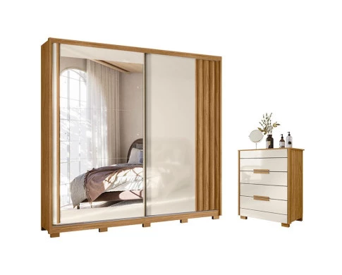 Começou a montar seu quarto? Então apresentamos para você este belo conjunto composto pelo guarda roupa e cômoda da linha Dhara. O guarda roupa conta com duas portas deslizantes, sendo uma com espelho. Os detalhes ripados agregam charme, enquanto internamente suas três gavetas oferecem mais organização. Complementando o conjunto, a cômoda possui quatro gavetas. Assim como o guarda roupa, a cômoda possui corrediças telescópicas e pés em PVC. Fabricados pela Moval, são desenvolvidos em MDP de alta qualidade, perfeito para quem busca praticidade e estilo, aproveitem!