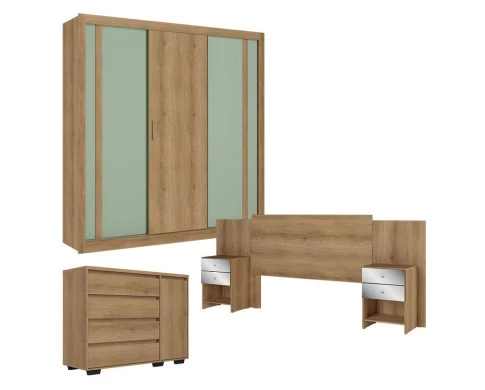Conjunto completo e funcional para o quarto do casal! O Guarda-Roupa Ibiza possui 3 portas e ótimo espaço interno para roupas e acessórios. A Cômoda com Porta Aurora oferece armazenamento extra, enquanto a Cabeceira Formosa finaliza o conjunto com estilo. Estrutura resistente em MDP e acabamento Capuccino/Menta Flex que combina com qualquer decoração moderna.