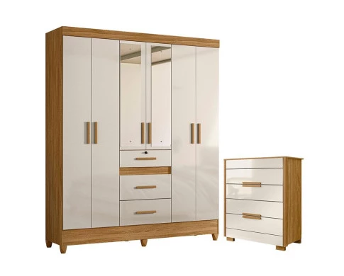 Organize seu quarto com elegância e o melhor custo benefício do mercado. Apresentamos o Guarda Roupa Casal Itatiba e Cômoda Dhara fabricados pela Moval. Guarda Roupa possui 06 portas sendo as centrais com espelho, 03 gavetas com corrediças metálicas sendo a primeira gaveta equipada com chave, puxadores em MDF, cabideiros em alumínio para melhor organização interna e pés em PVC. A cômoda possui 04 gavetas com corrediças telescópicas, moldura lateral de 25mm, tampo de 15mm, puxadores em MDF e pés em PVC. Fabricado com materiais de alta qualidade que garante resistência e durabilidade ao produto. Confira mais detalhes e aproveite!
