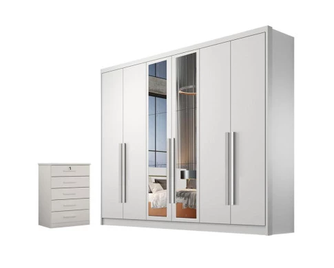 Precisando de móveis para seu quarto? Apresentamos esse conjunto fabricado pela Novo Horizonte, guarda roupa da linha Livorno 6 portas e 4 gavetas espaçosas, com prateleiras bem distribuídas e cabideiros que facilitam a organização de roupas, acessórios e calçados. A cômoda gaveteiro da linha Suíça possui 5 gavetas funcionais, sendo 1 delas com chave. Fabricados com materiais de alta qualidade em MDO/MDF, garantem qualidade e resistência. Para mais funcionalidade no dia a dia, e um ambiente aconchegante garanta já o seu!