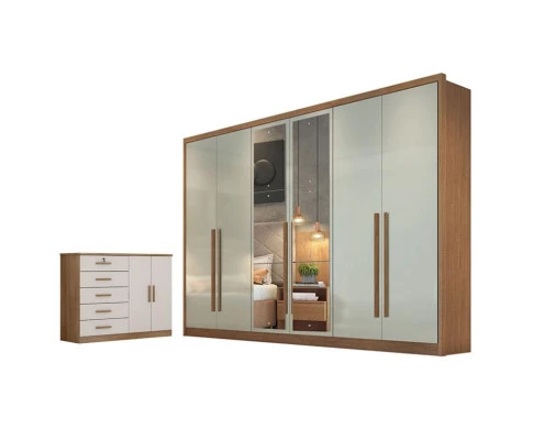 Guarda Roupa Casal Livorno com Nicho e Espelho e Cômoda Seul Cumaru 25 Fendi - Novo Horizonte