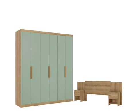 Guarda Roupa Casal Milan 6 Portas Capuccino Menta Acetinado e Cabeceira com Mesas de Cabeceira Formosa Capuccino - THB