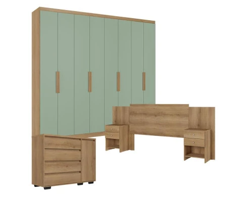 Transforme seu quarto com o Guarda-Roupa Casal Milan 8 Portas Capuccino/Menta, a Cômoda com Porta Aurora e a Cabeceira Formosa Capuccino. Um conjunto completo que oferece excelente espaço interno, organização prática e um design moderno com toque de elegância. Ideal para quem busca qualidade, estilo e funcionalidade em um só ambiente!