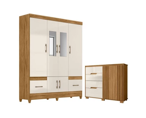 Guarda Roupa Casal MS912 com espelho e Cômoda Texas Freijó Off White – Moval