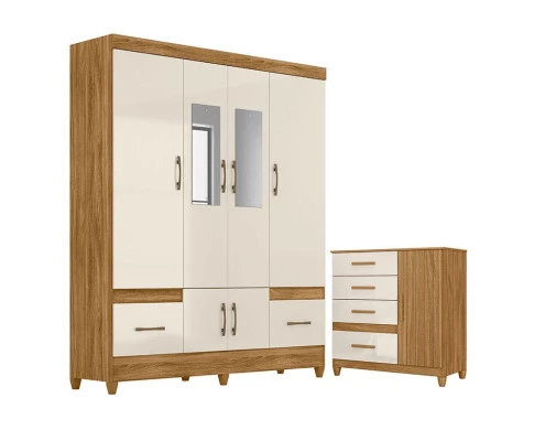 Guarda Roupa Casal MS912 com espelho e Cômoda Vênus com pés Freijó Off White – Moval