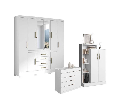 Guarda Roupa Casal Nápole 2045149 com Armário Multiuso Florença 2000199 e Cômoda Sapateira Sevilha 2004147 Branco Brilho - Aramóveis