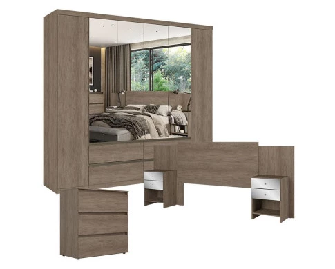 Guarda Roupa Casal Nobre 6 Portas Full Glass com Cômoda Gaveteiro Condessa e Cabeceira Formosa Glass Rustic Acetinado - THB