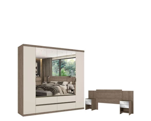 Guarda Roupa Casal Nobre 6 Portas Full Glass Rustic Off White e Cabeceira com Mesas de Cabeceira Formosa Glass Rustic- THB