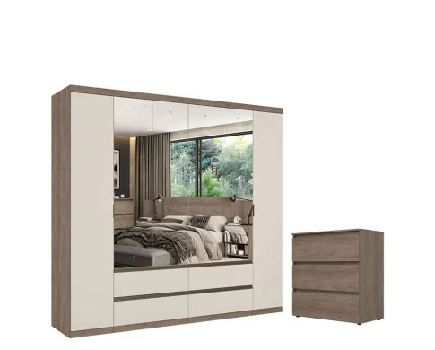Guarda Roupa Casal Nobre 6 Portas Full Glass Rustic Off White e Cômoda Gaveteiro Condessa Rustic Acetinado - THB