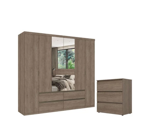 Guarda Roupa Casal Nobre 6 Portas Glass e Cômoda Gaveteiro Condessa Rustic Acetinado - THB