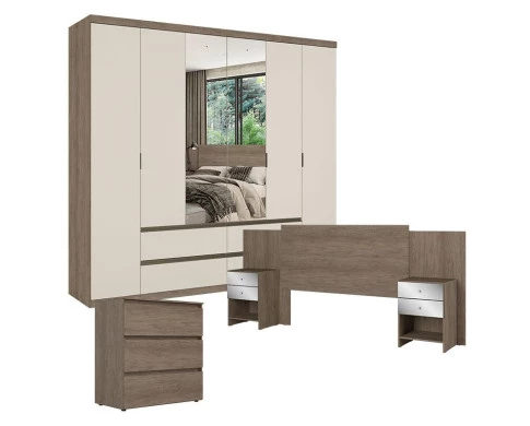 Guarda Roupa Casal Nobre 6 Portas Glass Rustic Off White com Cômoda Gaveteiro Condessa e Cabeceira Formosa Glass Rustic - THB