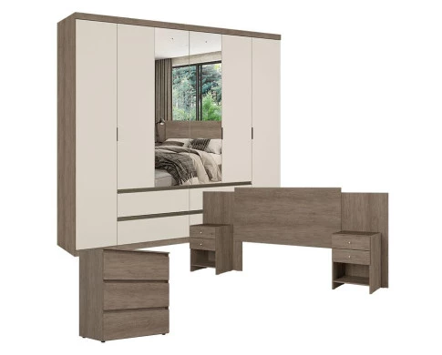 Guarda Roupa Casal Nobre 6 Portas Glass Rustic Off White com Cômoda Gaveteiro Condessa e Cabeceira Formosa Rustic - THB