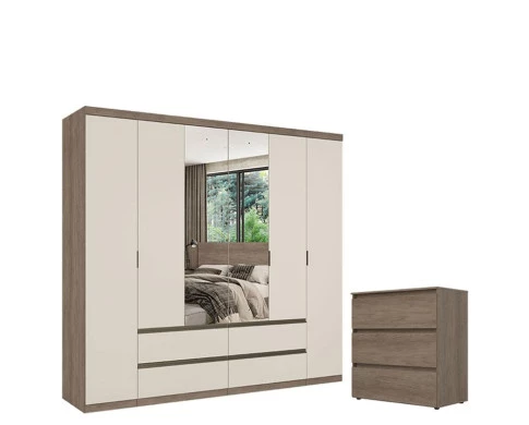 Guarda Roupa Casal Nobre 6 Portas Glass Rustic Off White e Cômoda Gaveteiro Condessa Rustic Acetinado - THB
