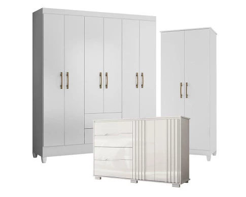 Guarda Roupa Casal Panamá com Cômoda Texas e Armário Multiuso Jade Branco Brilho– Moval