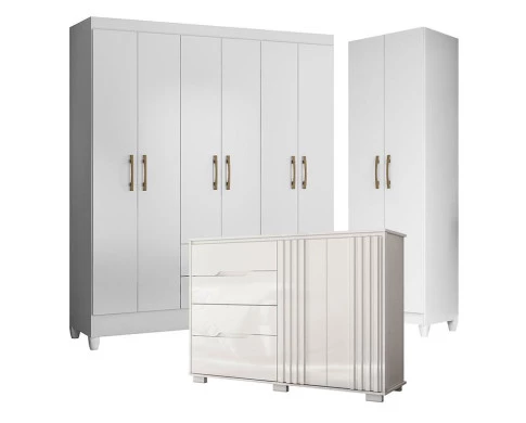 Guarda Roupa Casal Panamá com Cômoda Texas e Armário Multiuso New Íris Branco Brilho– Moval